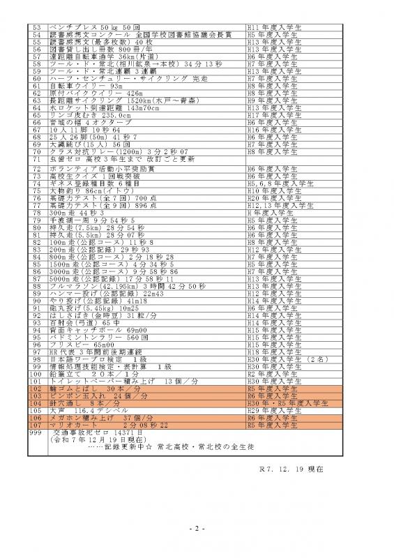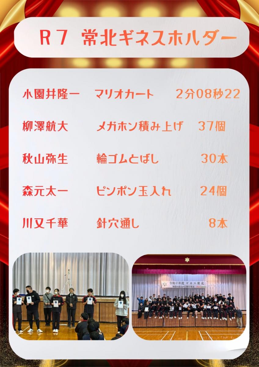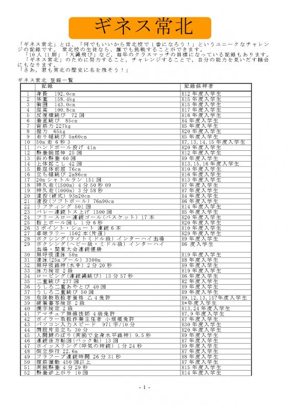 「ギネス常北」とは、「何でもいいから常北校で1番になろう!」というユニークなチャレンジの記録です。 常北校の生徒なら、誰でも挑戦することができます。 「ギネス常北」のために努力すること,チャレンジすることで,自分の能力を見いだす機会にもなります。