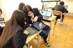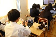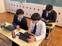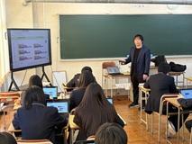 プログラミング学習は現代社会で求められている力を身につけるために重要ですが、アルファベットや数字、記号などが多いため、苦手意識を持つ生徒が少なくありません。そこで情報Ⅱの授業に、DX課外でもお世話になっている植竹智央さん(For Everyone Study 代表兼コーディネーター)をお招きして、スマートフォンを使ったアプリづくりに挑戦しました。いきなりプログラミング言語を使うことは難しいですが、アプリを利用することによって直観的にプログラミングの基本的な考え方を学ぶことができます。生徒は様々な音を出すアプリづくりに取り組み、楽しみながらも一生懸命に授業を受けていました。