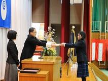 卒業式の前日に表彰式が行われました。3年生の一カ年皆勤賞として、菅野凌汰さん(常北中出身)、山田歩未さん(常北中出身)が、令和7年度茨城県高体連加盟学校長推薦生徒として卓球部の秋山弥生さん(常北中出身)が受賞しました。また、朝トレコンクール成績優秀者として、同率1位の3名、加藤木理桜さん(1年・常北中出身)、片見連さん(2年・常北中出身)、田沼元輝さん(2年・水戸五中出身)が、最優秀クラスの代表として森島琉生さん(3年・常北中出身)が登壇しました。その後、記念品贈呈式が行われ、在校生代表 森元太一さん(2年・常北中出身)から、卒業生代表 藤田吏稀さん(常北中出身)に、卒業記念品の認め印が贈られました。