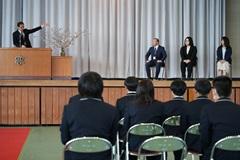 今年度から常北校に赴任された4名の先生方の新任式が4月3日(金)に行われました。新しい先生方のあいさつに応えるように、生徒会副会長の徳田一真さん(2年・常北中出身)が歓迎の言葉を述べました。出会いがあれば別れがあり、令和7年度末までお世話になった4名の先生方が退職や転出されることとなりました。離任式では、同じく生徒会副会長の森元太一さん(3年・常北中出身)からのお礼の挨拶や在校生からの花束贈呈の後、離任される先生方から、お一人ずつおのメッセージをいただきました。離任された先生方の思いをしっかりと受け継ぎ、新任の先生方と常北校一丸となって教育活動に励んでいきたいと思います。